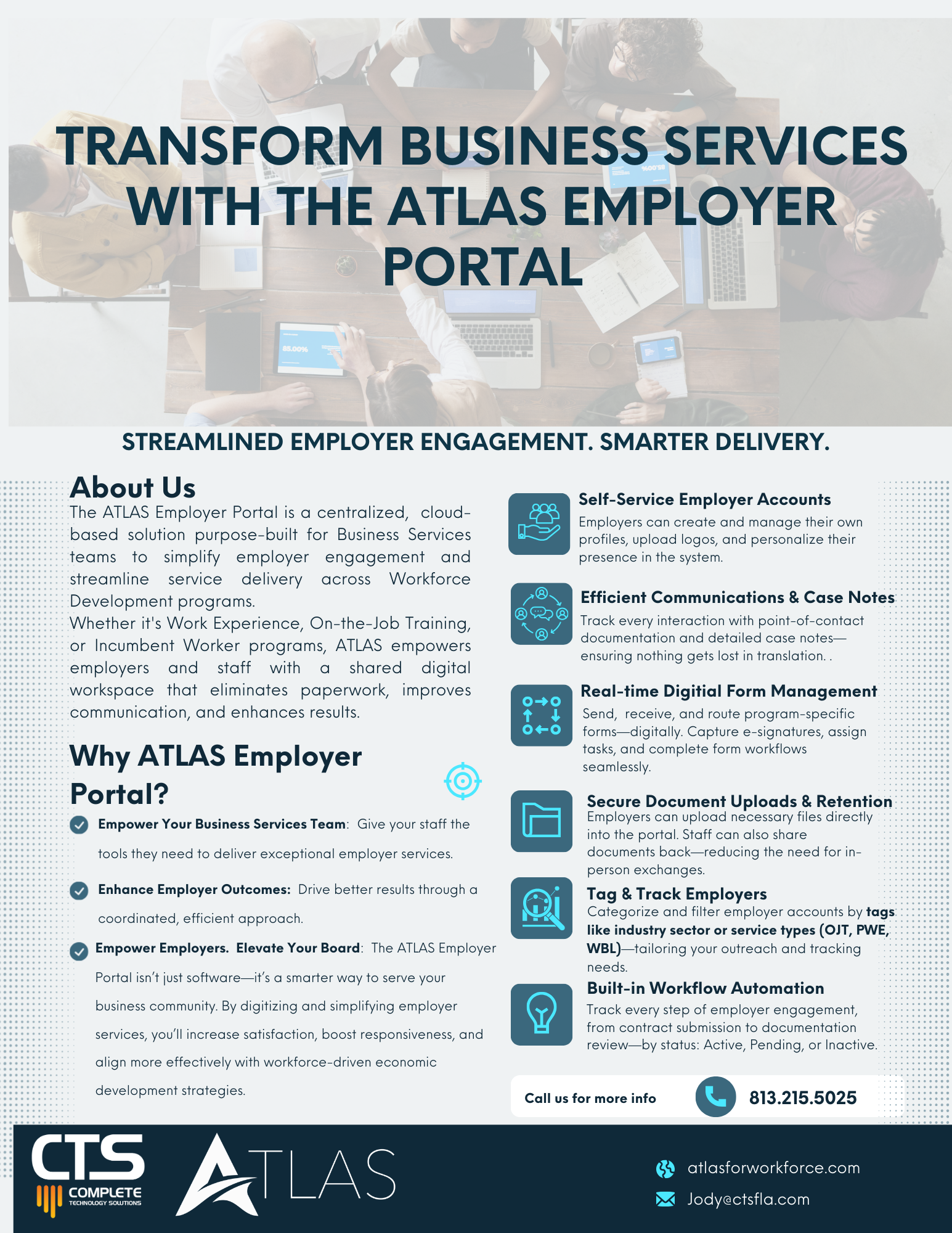 The ATLAS Employer Portal not only increases employer satisfaction and responsiveness—it empowers Boards to manage their business services pipeline more effectively, track employer outcomes, and support workforce-aligned economic development.